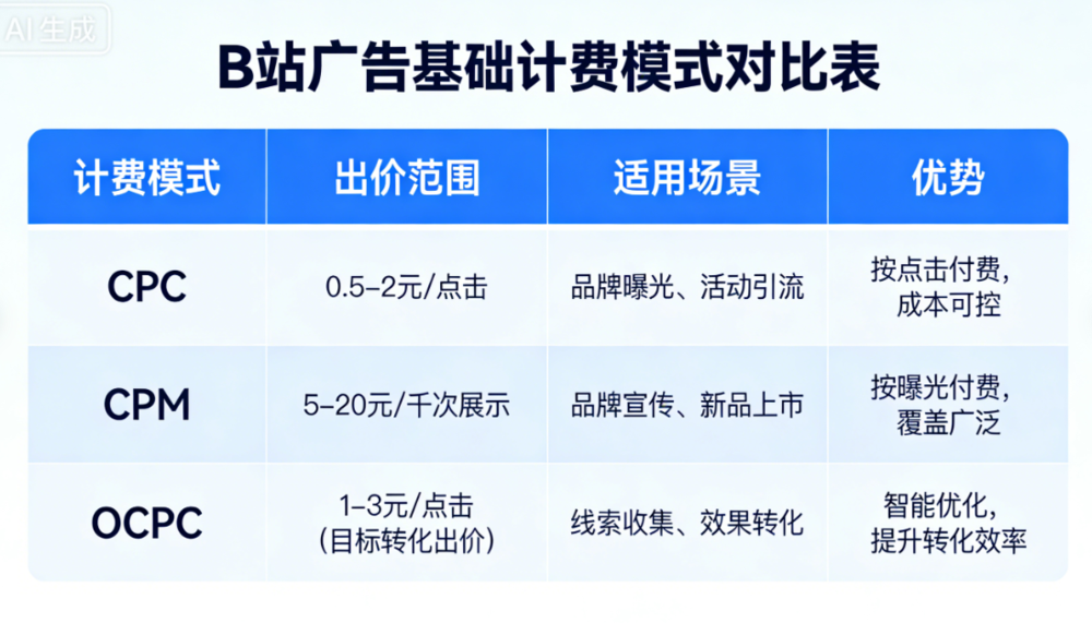 B站廣告投放價(jià)格表|新手必藏!告別計(jì)費(fèi)暈,不花一分冤枉錢發(fā)表時(shí)間:2026-01-26 12:15 寶子們!做B站投放總被計(jì)費(fèi)規(guī)則搞暈?不知道該選CPC還是CPM?整理了超全的,新手直接抄作業(yè),看完再也不花冤枉錢! 作為深耕新媒體投放的老玩家,說(shuō)B站的年輕用戶群體真的香,但計(jì)費(fèi)方式選不對(duì),預(yù)算分分鐘打水漂! 今天把核心B站廣告投放計(jì)費(fèi)模式、較低出價(jià)、建議預(yù)算一次性說(shuō)透,附避坑Tips~ ?? 基礎(chǔ)廣告計(jì)費(fèi)(新手入門選擇) 這部分是常用的投放模式,門檻低,適合預(yù)算有限的新手和中小企業(yè),要點(diǎn)看這里! ? CPC單次點(diǎn)擊計(jì)費(fèi):較低出價(jià)0.5元起!別盲目抬價(jià),建議出價(jià)1-1.5元左右性價(jià)比高~ 適合想準(zhǔn)確獲客的寶,按點(diǎn)擊收費(fèi),沒點(diǎn)擊不花錢,對(duì)轉(zhuǎn)化目標(biāo)明確的投放超友好。 ? CPM千次曝光計(jì)費(fèi):較低1元就能起投!千次展示成本一般在3-5元,適合品牌曝光、新品推廣。想讓更多人知道你的產(chǎn)品/賬號(hào),選這個(gè)準(zhǔn)沒錯(cuò),低成本覆蓋海量年輕用戶。 ? OCPC轉(zhuǎn)化出價(jià):智能出價(jià)模式,10-100元不等,具體看行業(yè)。要點(diǎn)!1天內(nèi)滿25個(gè)轉(zhuǎn)化,或3天累計(jì)10個(gè)轉(zhuǎn)化,就能進(jìn)入智能投放階段,系統(tǒng)會(huì)自動(dòng)優(yōu)化成本,適合有一定投放基礎(chǔ)的寶。